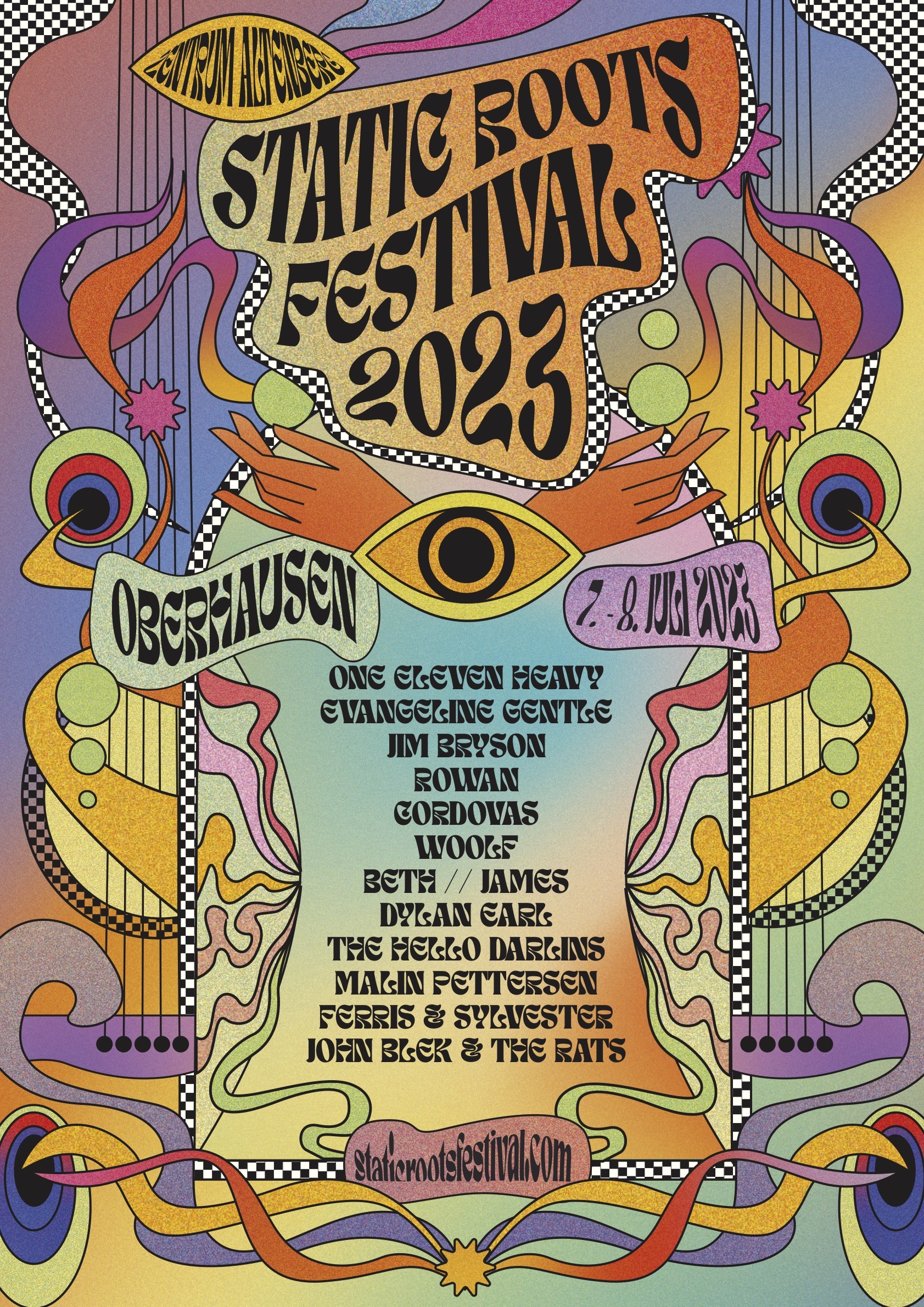 The Static Roots Festival 2023 poster is a harmonious blend of vibrant colors and intricate illustrations that evoke the atmosphere of the event. You'll find musical instruments, nature elements, and a nod to the industrial Ruhrvalley heritage, all woven together in a mesmerizing pattern. The design serves as a visual representation of the diverse lineup and the unique mix of Americana and roots music that festival-goers can look forward to.
